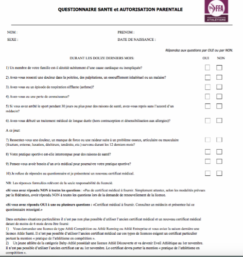 Ils doivent, avec leurs parents, renseigner un questionnaire relatif à leur état de santé mis en place par la FFAainsi qu'une autorisation parentale (voir document ci-dessous) pour pouvoir s'inscrire à la course.